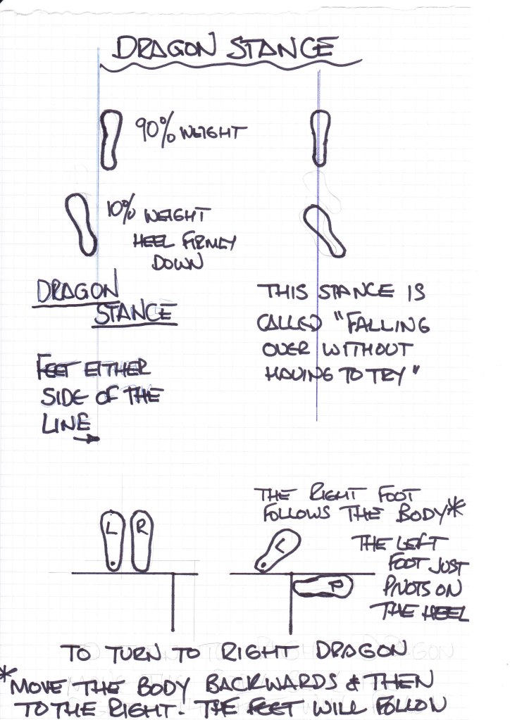 3, Egg and Spoon Race. I’ve added my sketch that I send to new members. Some, if not all the Dragon stances looked like the start of an egg and spoon race with 99% of the weight on the front foot while the rear foot had the heel off the ground. Most members had their heel down, but “if the cap fits, wear it”.